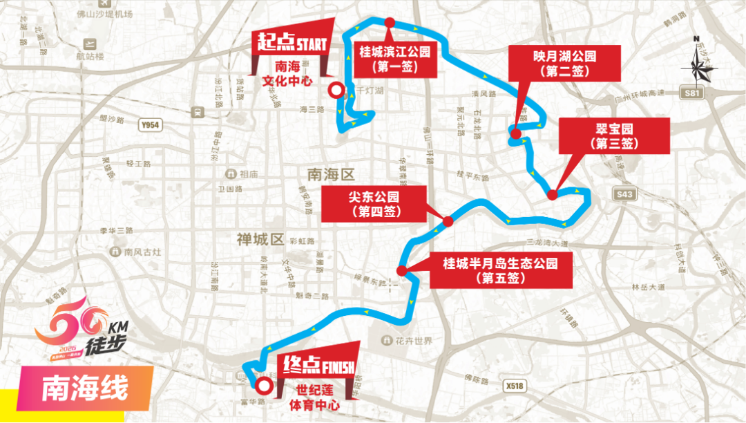 佛山城发、佛趣游联合总冠名——“美丽佛山 一路向前”2026佛山50公里徒步即将开走!3月21日(下周六),五区徒步线路将同步出发,最终汇聚到世纪莲体育中心 。