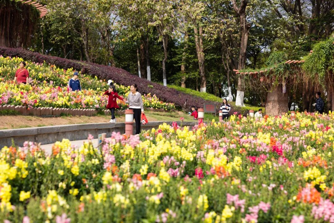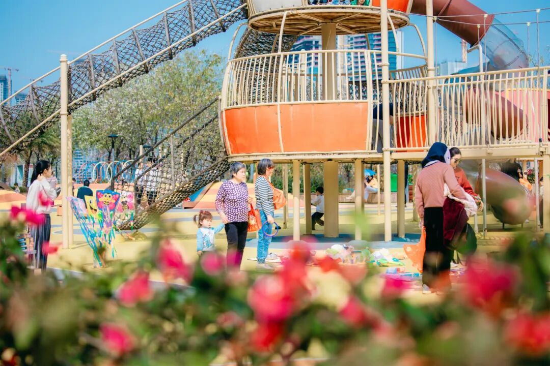 一旁的休闲区域与儿童乐园里,市民散步休闲、亲子游玩,处处洋溢着怡然自乐的温馨画面,春日的舒适与美好在这里尽显无遗。