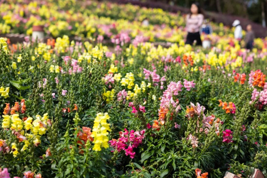 一路向前,千灯湖三期荟芳山花海连绵成片,成为春日最出片的打卡地。这里大面积种植的金鱼草色彩缤纷,红、粉、黄、白相间绽放,花姿挺拔如串串金铃。