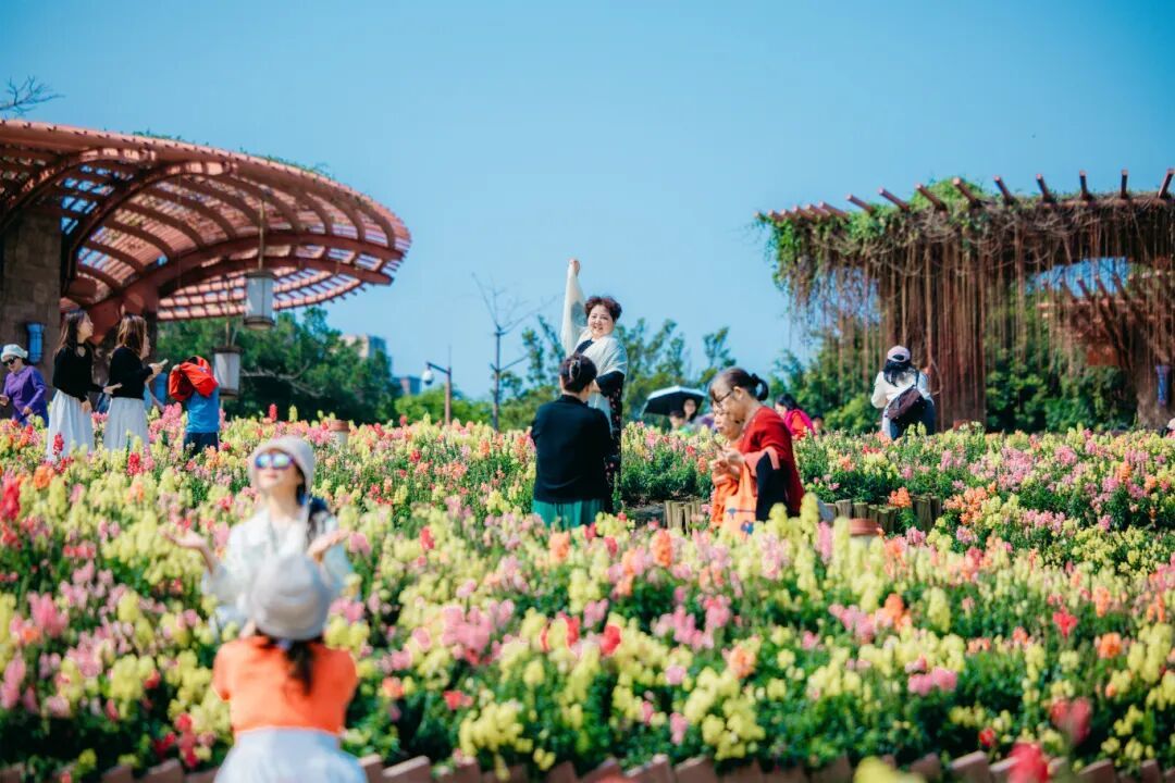 金鱼草喜阳光、较耐寒,春季开花最盛,花语“有金有余”,寄托繁荣吉祥,也象征着活泼与热情。不少市民驻足拍照,“花海与蓝天相映,随手一拍都是大片。”市民陈女士说。