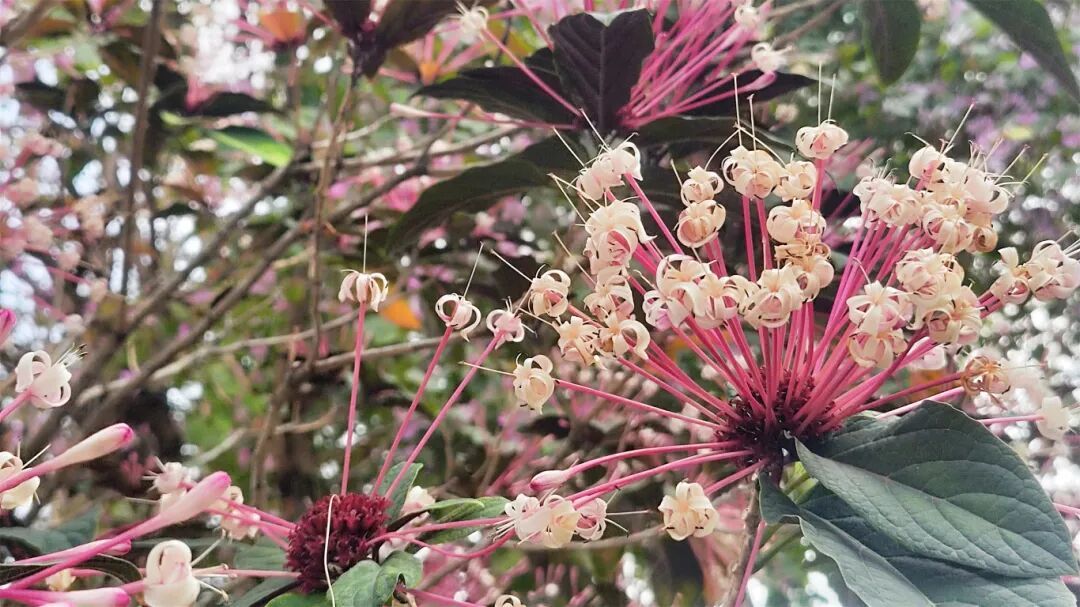 烟火树喜温暖湿润环境,花期长、颜值高,花语是惊艳与独特,象征着不被定义的美丽,为春日公园增添了一抹神秘又热烈的色彩。