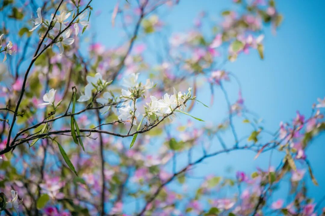 漫步桂城滨江公园又是另一番惬意舒适的景象,道路两侧宫粉紫荆、白粉洋紫荆花开满枝,粉白相间、淡雅清新,花瓣轻盈飘落,美不胜收。